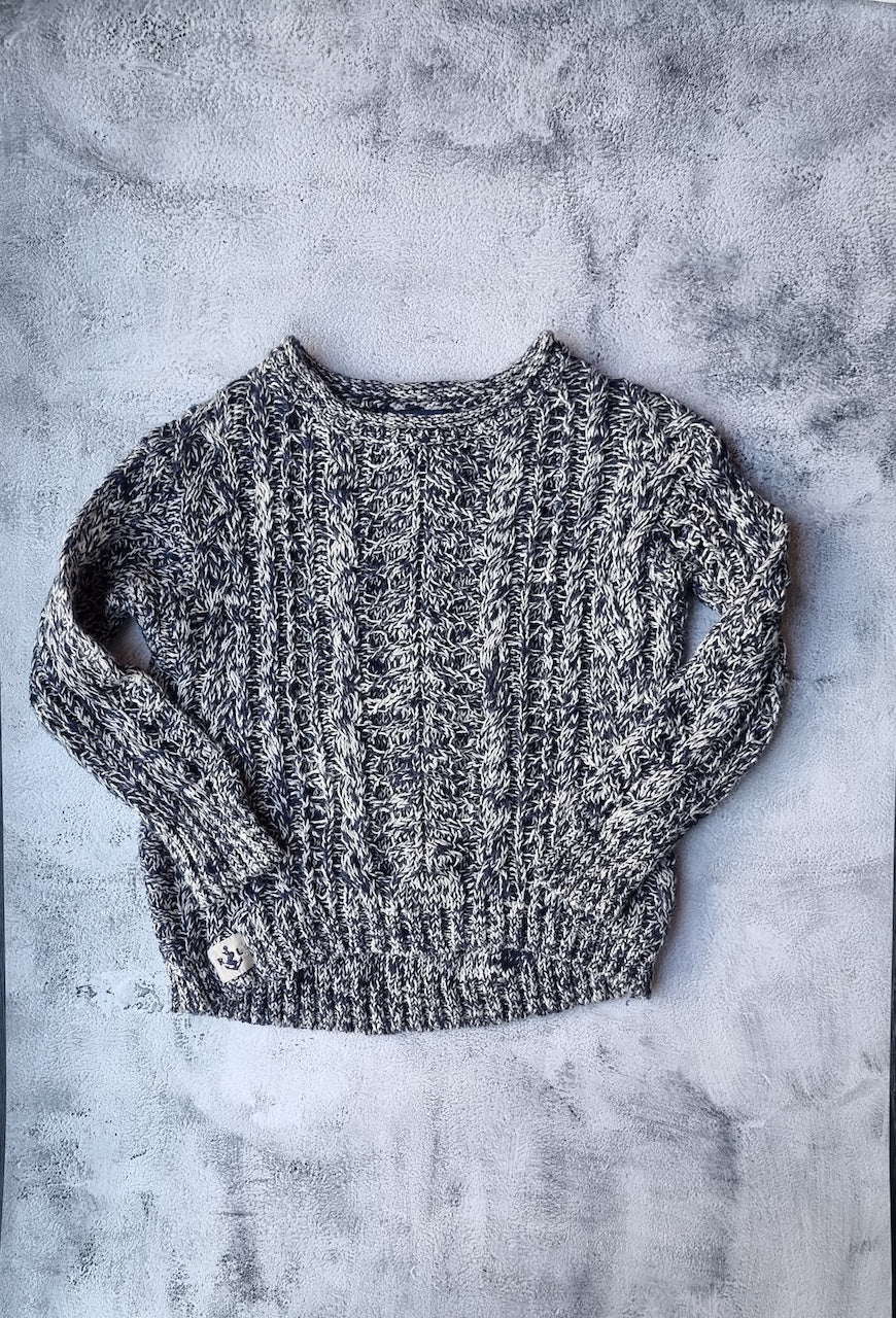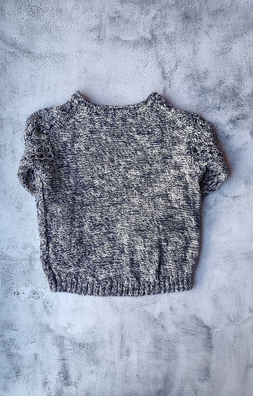 Suéter tejido en tonos grises. En la parte de adelante el tejido es más amplio y en la parte de atrás es cerrado.