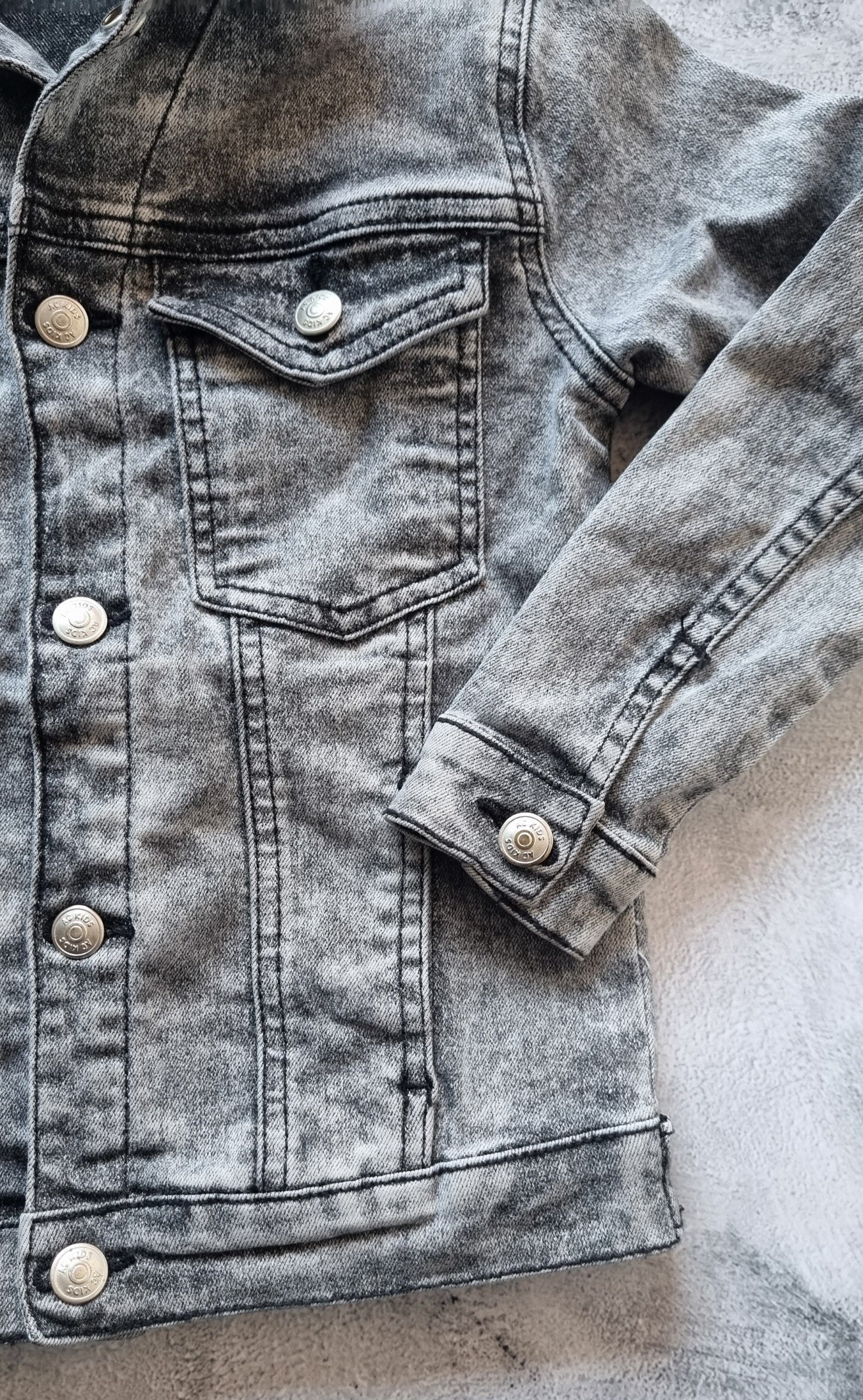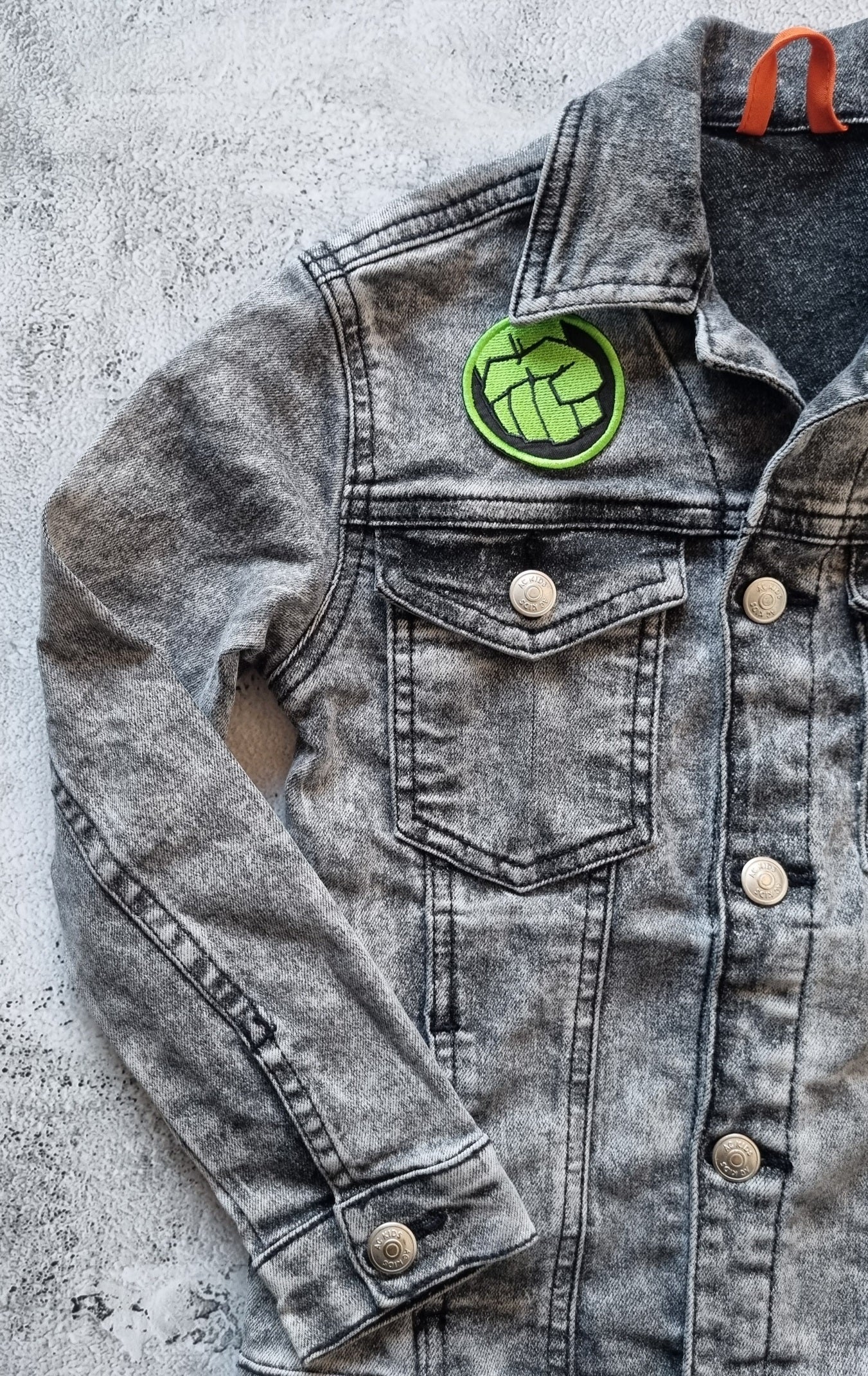 Chaqueta de jean stretch con parche en la parte de adelante y estampado en la espalda. De broches. Excelente estado.