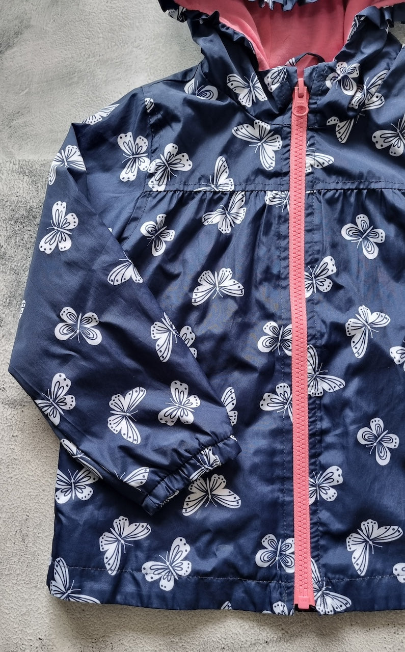 Chaqueta impermeable en excelente estado, con chompa y hermoso estampado de mariposas.
