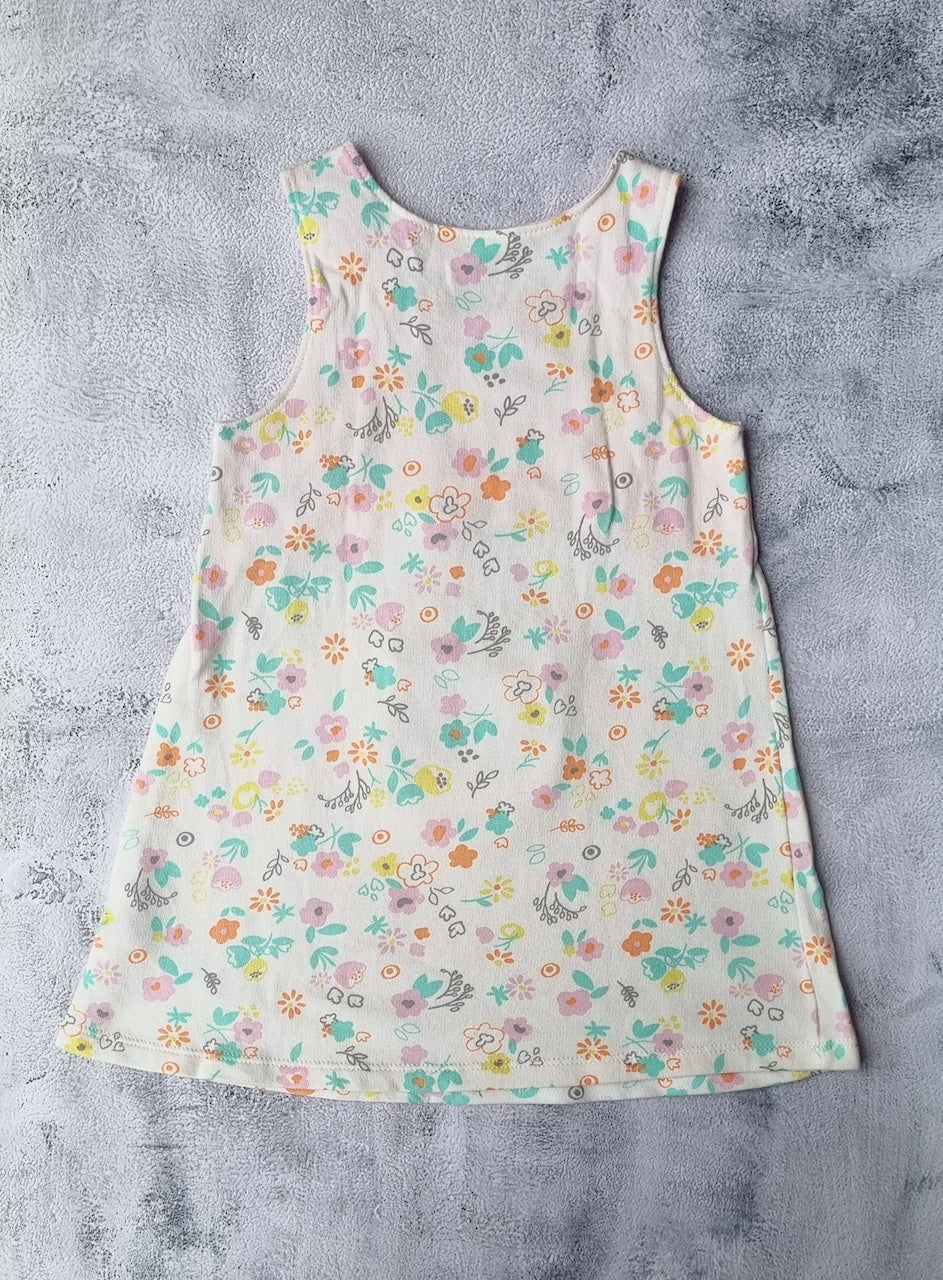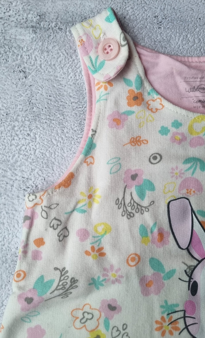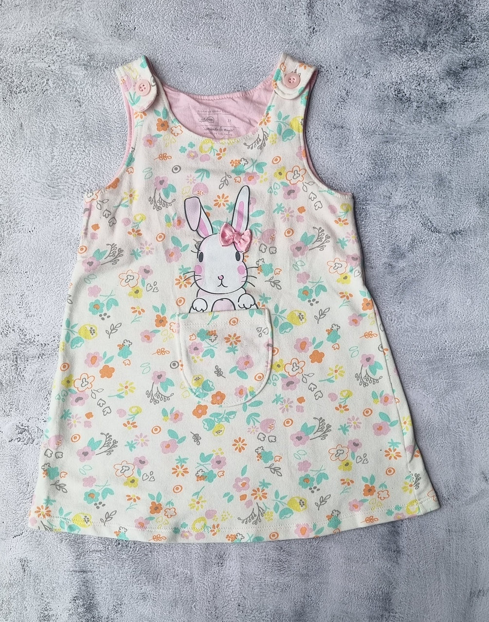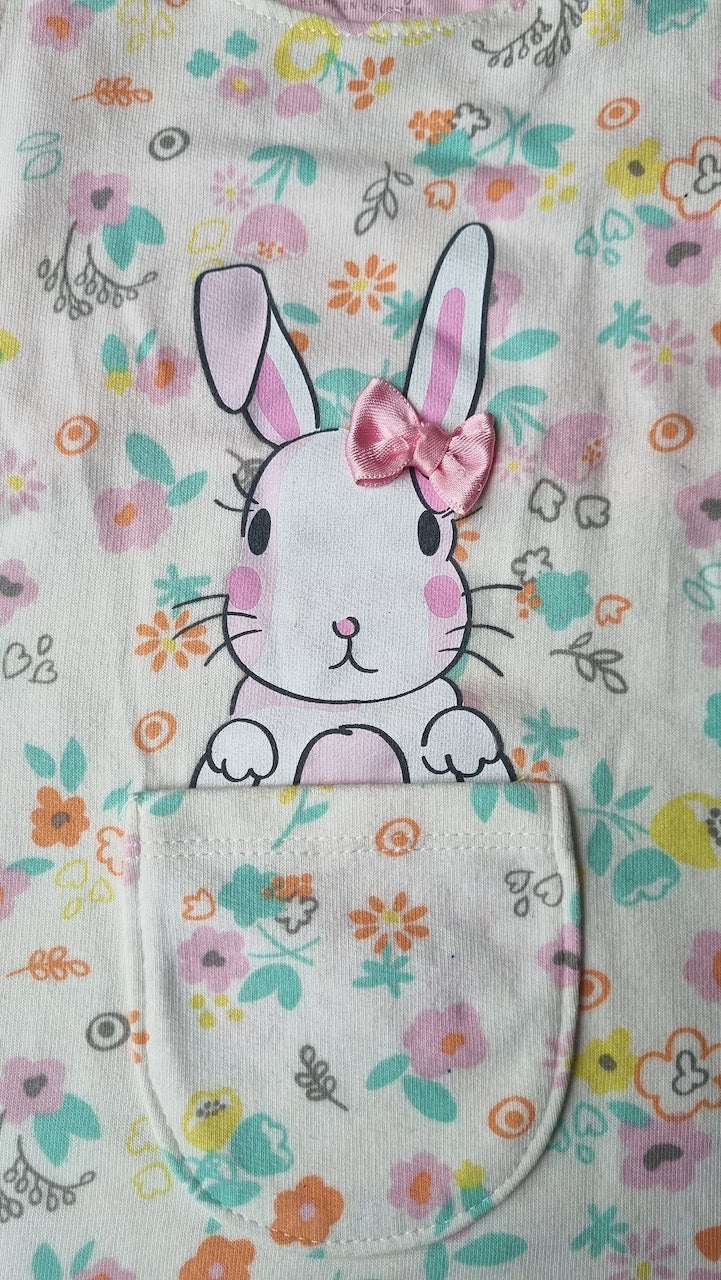 Hermosa jardinera de tela suave, estampado de conejita y bolsillo delantero.