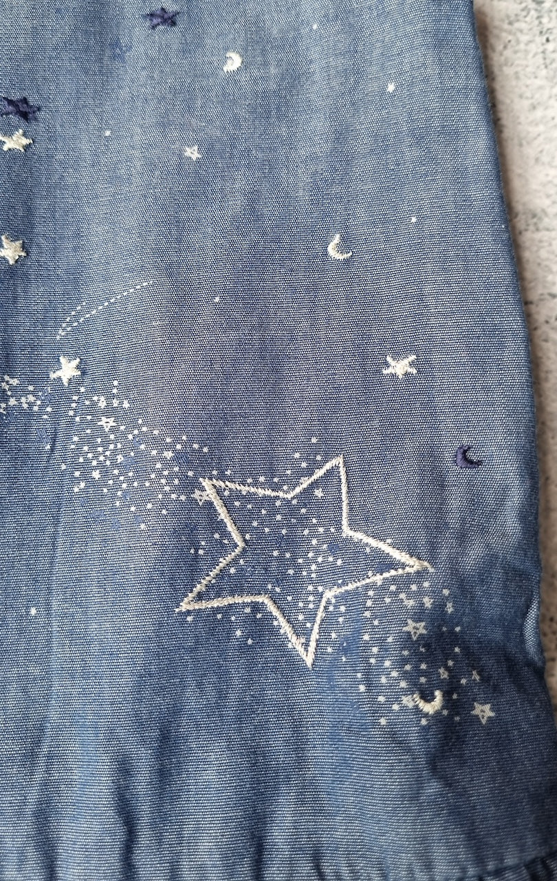 Vestido de tela delgada, con forro interno. Con bordado de estrellas y lunas. Excelente estado.