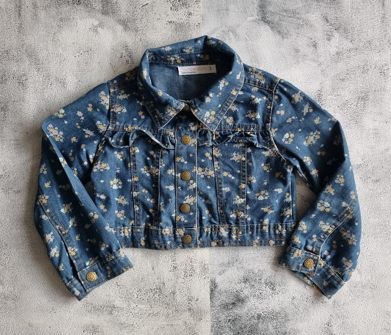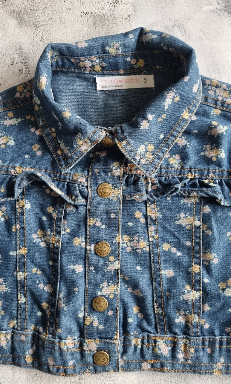 Chaqueta corta de jean delgada con estampado floral. En excelente estado. Tallaje pequeño.