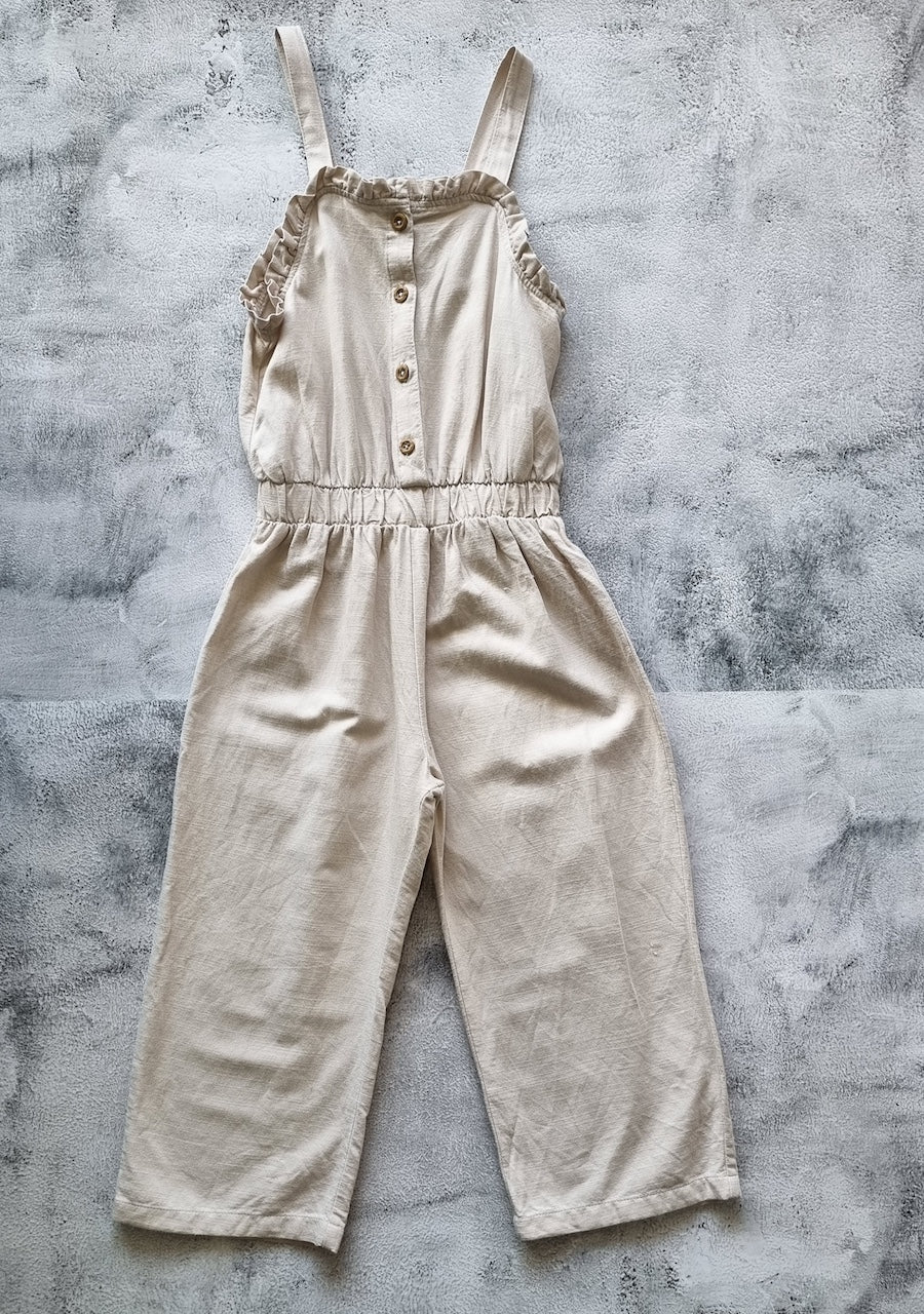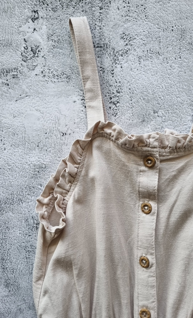 Enterizo color crudo en excelente estado, tela parecida al lino. Cargaderas ajustables y resorte en la cintura.