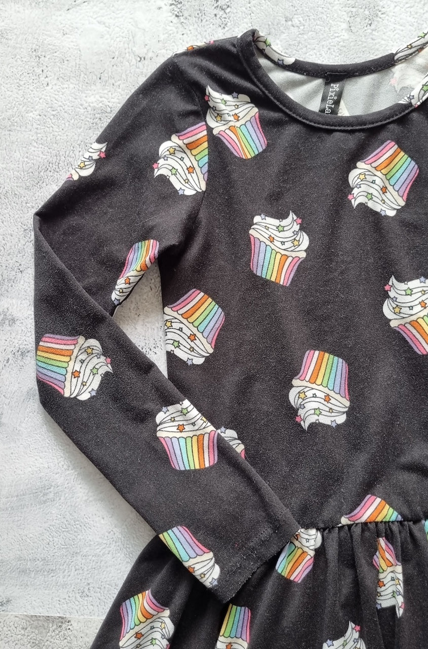 Vestido manga larga de tela fresca y cómoda, con estampado de cupcakes. Muy buen estado.